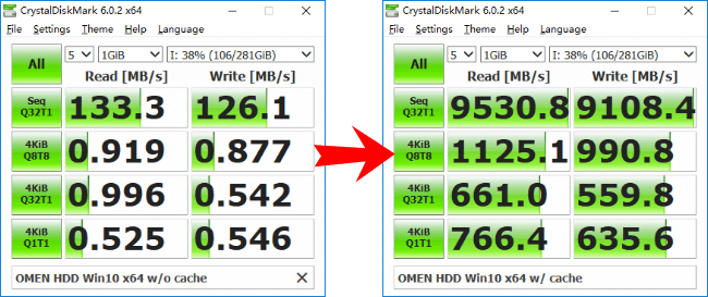 As measured on a mechanical hard drive with PrimoCache RAM caching, the drive benchmark scores increased more than 70 times in sequential read/write, and more than 500 times, even to 1000 times, in 4KB random read/write.1